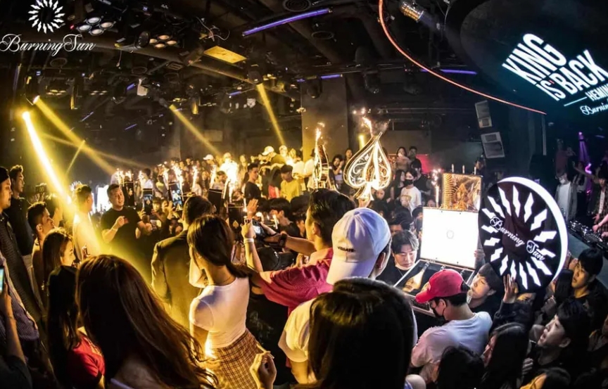 Hộp đêm Burning Sun là một cơ sở lớn bao gồm tầng hầm dành cho EDM, tầng hai dành cho hip hop, phòng VIP, 60 bàn VIP gần hộp DJ và sân khấu cũng như sàn nhảy rộng rãi, nó có thể chứa tới 1.000 khách cùng một lúc.