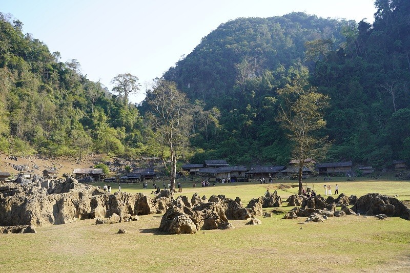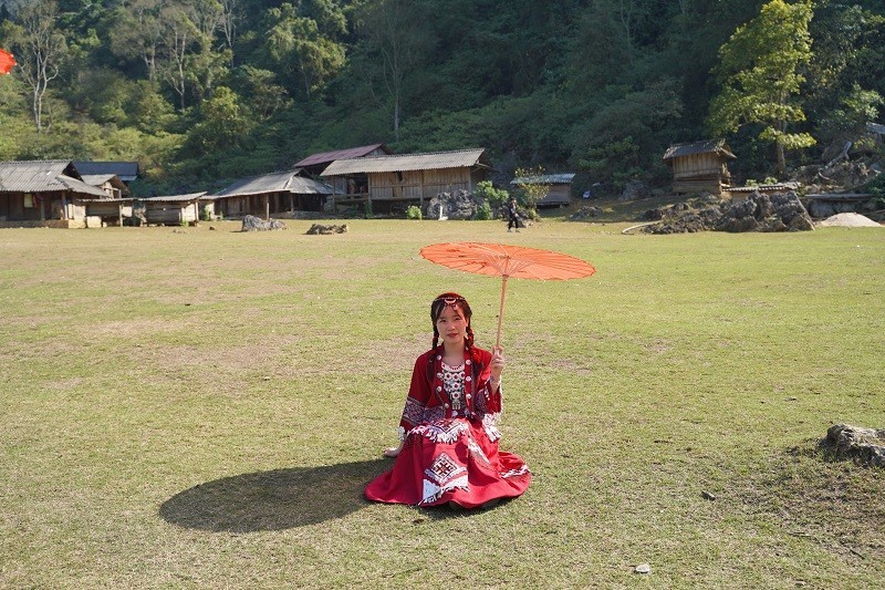 Phía sau cổng chào ấy là những lán hàng cho thuê trang phục để chụp ảnh và phục vụ ẩm thực với các món truyền thống đơn giản của người H’Mông. Đi qua những lán hàng mấy bước chân là một thung lũng cỏ nhỏ xinh hiện ra trước mắt cùng nhấp nhô vách đá tai mèo giữa bốn bề non xanh đẹp tựa cảnh thần tiên.