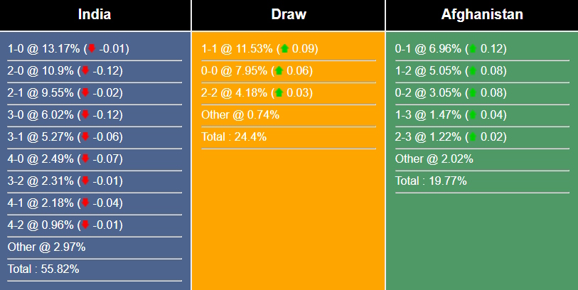 Tỷ số có khả năng xảy ra nhất để Ấn Độ giành chiến thắng là 1-0 với xác suất 13,17%. Tỷ số có khả năng xảy ra tiếp theo cho kết quả đó là 2-0 (10,9%) và 2-1 (9,55%). Tỷ số hòa có khả năng xảy ra cao nhất là 1-1 (11,53%), trong khi tỷ số mà Afghanistan thắng là 0-1 (6,96%).