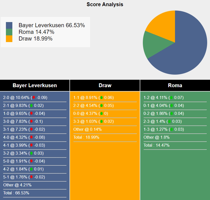 Tỷ số khả dĩ nhất để Bayer Leverkusen giành chiến thắng là 2-0 với xác suất 10,64%. Tỷ số có khả năng xảy ra tiếp theo cho kết quả đó là 2-1 (9,83%) và 1-0 (9,65%). Tỷ số hòa có khả năng xảy ra cao nhất là 1-1 (8,91%), trong khi tỷ số mà Roma thắng là 1-2 (4,11%).