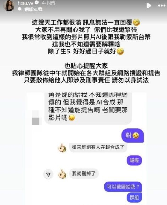 Xia Junting cho biết vào tối ngày 16 vừa qua cô nhận được rất nhiều tin nhắn từ người hâm mộ và được biết có người đã sử dụng AI để thay đổi khuôn mặt của cô để quay phim người lớn. Nữ CEO bày tỏ: “Tôi thường xuyên nhận được những video và hình ảnh như vậy, AI (giả mạo), tống tiền tôi bằng Đài tệ. Tôi cũng muốn nhắc mọi người rằng nhóm pháp lý của chúng tôi đã tìm kiếm bằng chứng và nộp đơn kiện đối với các nhóm chat trên Internet" kể từ buổi trưa nay (theo giờ địa phương). Xin vui lòng đừng làm những hành động trái pháp luật".